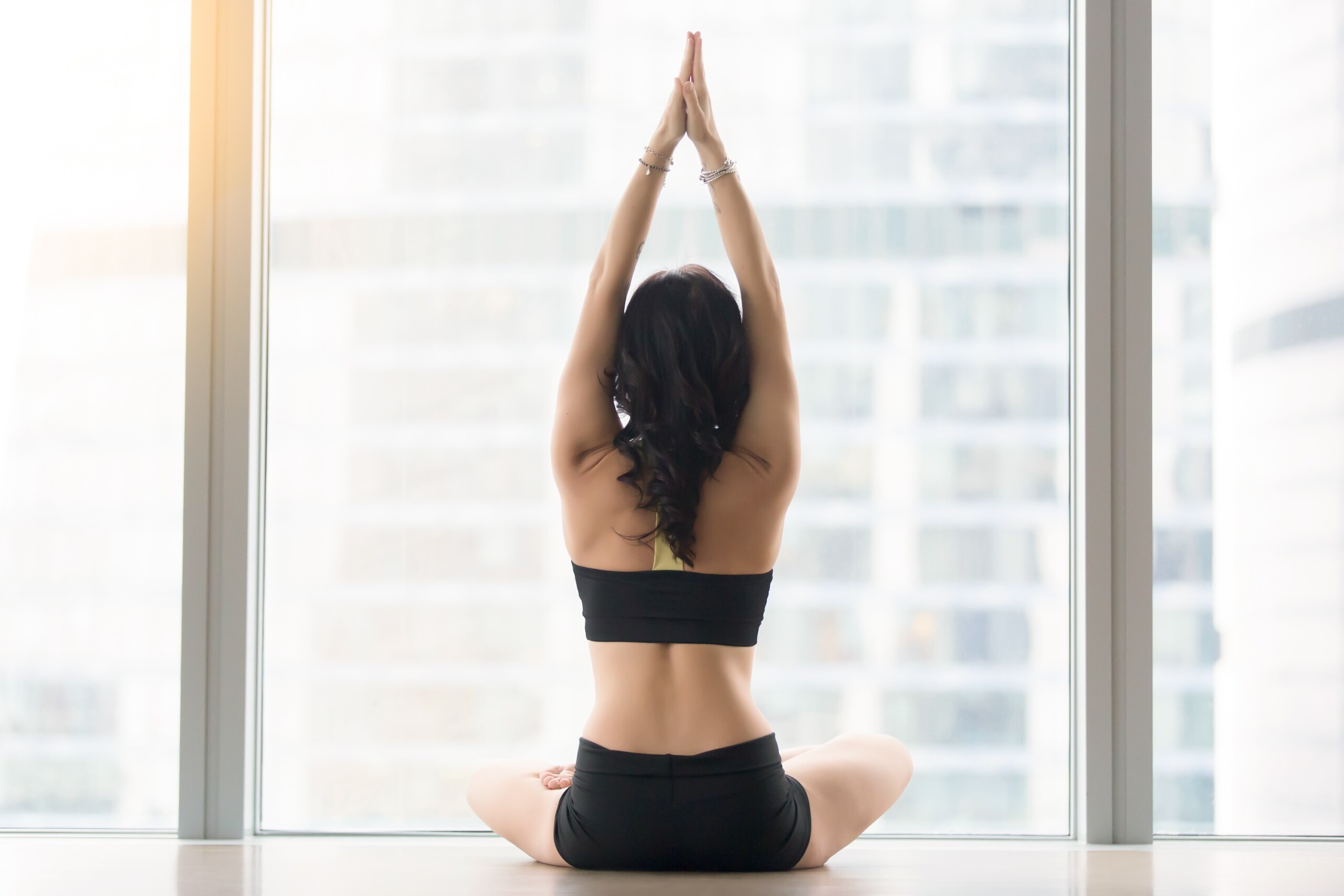 Rear view of young woman sitting in Ardha Padmasana pose